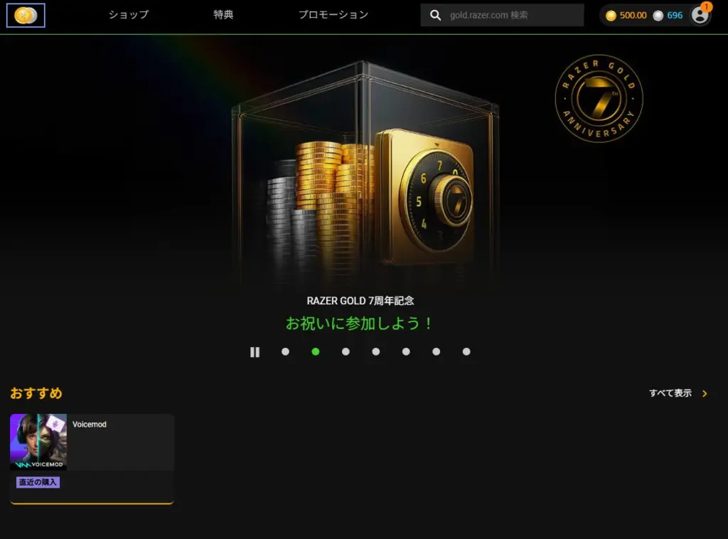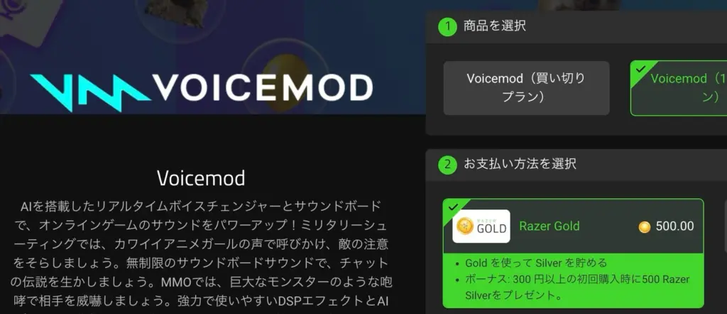 そんなVoicemodに、クレジットカードを使わずに購入できる新たな方法が登場しました。今回注目したいのは、Razer Goldショップで購入できる「Voicemod 1ヶ月 買い切りプラン(500円)」です。支払い方法のハードルが下がったことで、これまで導入を迷っていた方でも、より気軽にVoicemodを利用できるようになりました。