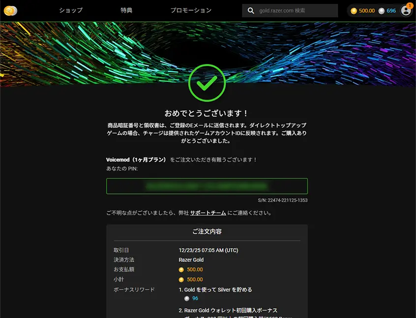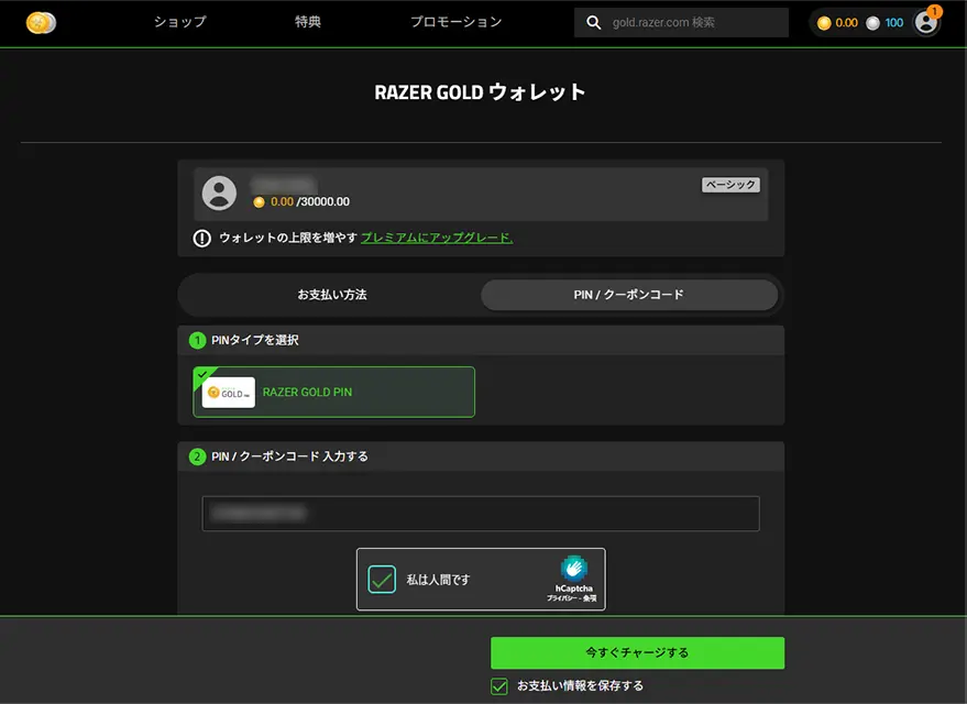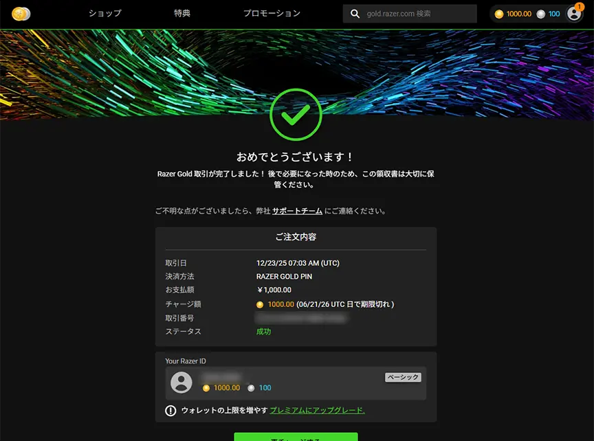 購入後は、カードに記載されているコードを「Razer Gold」の公式サイトで入力することで、すぐにウォレットへチャージされました。