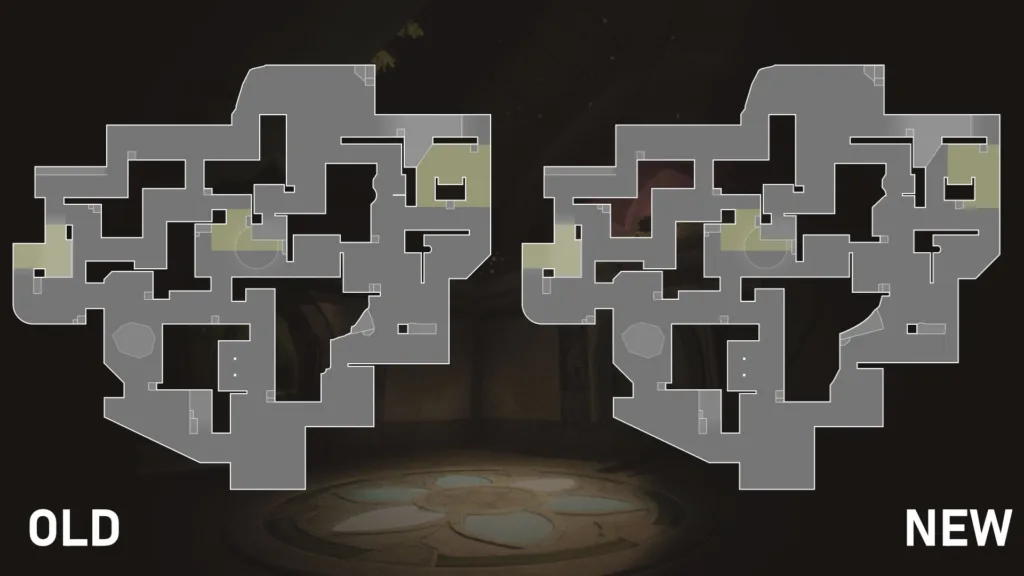 この変更により、守備側はこれまで以上に深い位置で相手を待ち伏せる選択肢が増え、攻撃側はサイト進入前にこの窪みをアビリティやクリアリングで丁寧に処理する必要が出てきます。わずかな地形の変化ですが、ラウンド序盤のメイン争いにおいて重要なアクセントとなるでしょう。